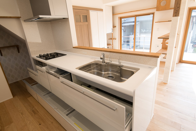 オープンキッチンがすっきり見えるよう、奥に色々しまえる収納スペースを設置。こちらは二階への階段のデッドスペースを利用しています。