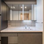 洗面化粧台はLIXIL製の『ルミシスボウル一体タイプ』 既製品とリフォシーでの造作の組み合わせで完成したこだわりの洗面室です。 洗面台向かって左側はパウダースペースになっており、椅子に腰掛けてお使いいただけます。 毎日目に入るモザイクタイルは奥様にお選び頂き、こちらで施工しました。 造作の収納も二か所増設し、ルミシスの収納と合わせ大容量となっています。 洗濯機置き場は出来るだけすっきりと給水と電源が上部収納の扉で見えない仕様に。