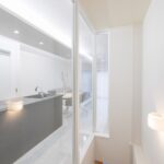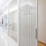 玄関からLDKに入る建具は、ガラス壁と統一感のある光を通すタイプの建具(引き戸)になりました。 天井高がありますのでサイズオーダーいたしました。 この建具とガラスの間仕切りは二期工事で天窓のある廊下と繋がりができる予定です。 昼間は光が差し込み、ガラスの間仕切りが生きるのではないかなと楽しみです。