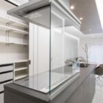 ▲こちらは玄関からガラス壁を通して見たLDK。キッチン後ろの棚を閉めるとスッキリします。急な来客にも安心。