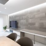 一見シンプルなお部屋ですが、キッチンの上部や天井壁側に間接照明を入れて空間に奥行を出しています。 フロアは大理石調フローリング、『ニドムエコ/丸玉木材株式会社、ホワイトマーブル柄』になります。 今回、Y様本物の大理石や大理石調タイルにも心惹かれている様でしたが、 ・足元のひんやり感 ・物を落とした時のお互いの割れ をポイントに《大理石調のフローリング》に絞られました。 そこから各々メーカー大理石調のフローリングが出ており、ほとんどのメーカーのサンプルを取り寄せし、どの商品が傷が付きにくいかを上から物を落としたり、引っかいたりをY様と一緒に検証させて頂きました。 その結果ニドムエコがより強く柄も落ち着きがあり無事採用となりました。 その打合せの中で、残念ながら傷は付きやすいのですが磨きを掛けた大理石さながらのツヤ感があるフローリングとどちらかY様頭を悩ませてらっしゃったのですが、今回はUVフロアーコーティングを提案させて頂きました。 そちらを行う事によってよりツヤが出て高級感も増し、傷も付きにくくなります。Y様ご夫婦のこだわりです。 石のタイルのような風合いを持つグレーの壁は、「エコカラット+/ストーングレース・ダークグレー」。 エコカラットは湿度が高い時は湿気を吸収し、乾燥している時は湿気を放出してくれる優れもの素材。 湿気がたまりませんので「におい」対策にもなります。 >>LIXIL エコカラットの詳細はこちら