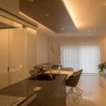昼間とは雰囲気が変わり、とてもムーディーな雰囲気に。 夜の時間もゆっくりとくつろいでいただけるLDKです。