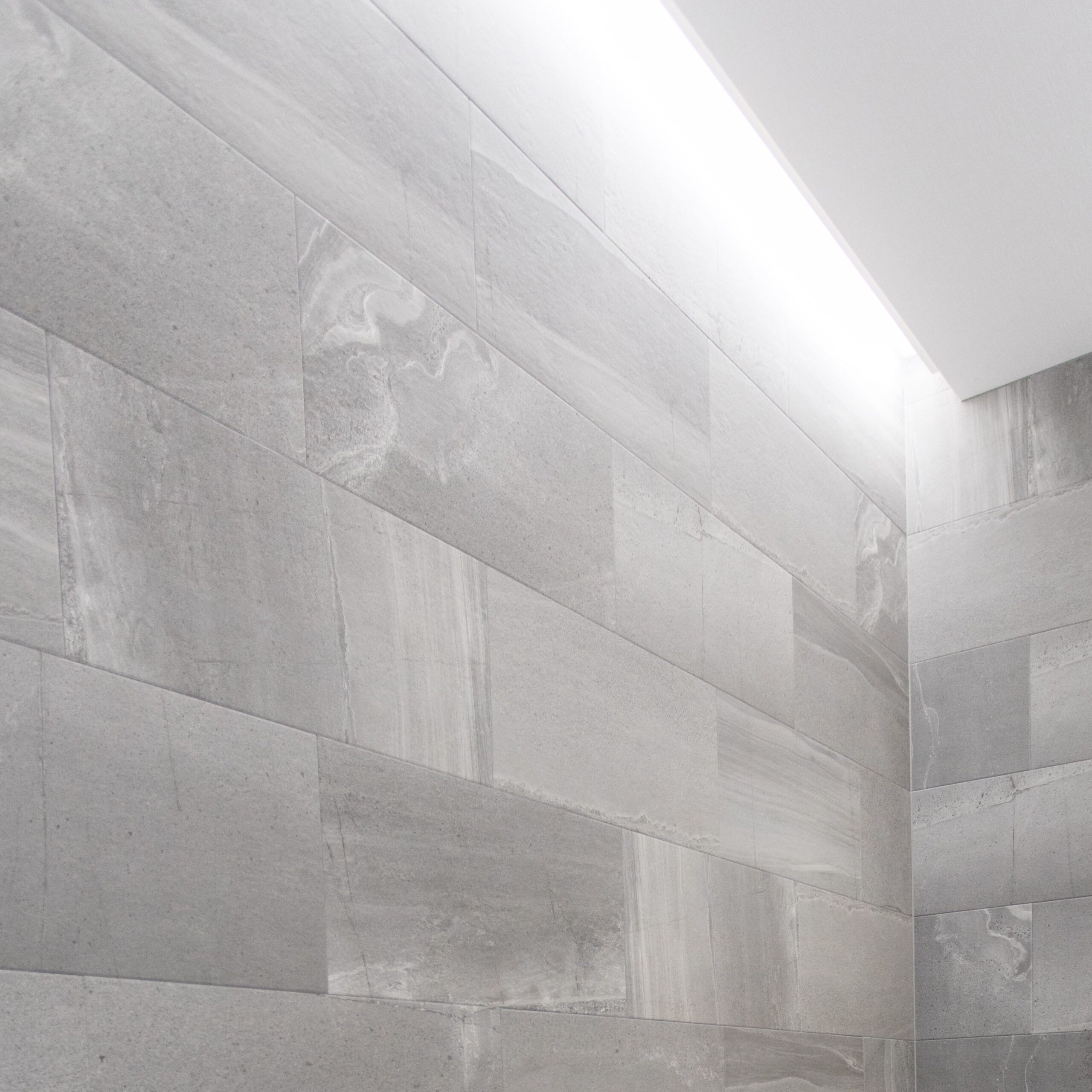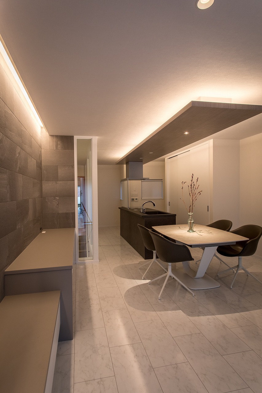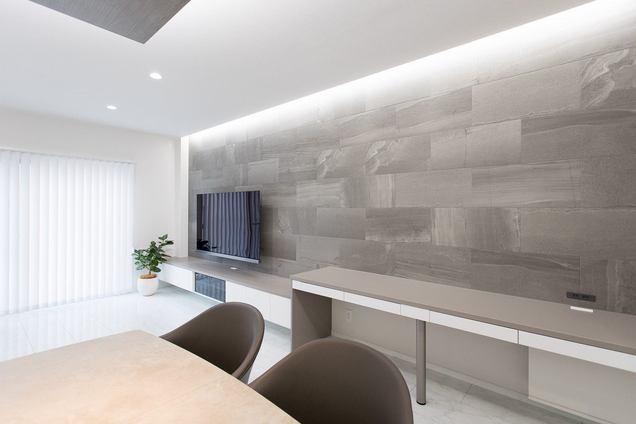 一見シンプルなお部屋ですが、キッチンの上部や天井壁側に間接照明を入れて空間に奥行を出しています。 フロアは大理石調フローリング、『ニドムエコ/丸玉木材株式会社、ホワイトマーブル柄』になります。 今回、Y様本物の大理石や大理石調タイルにも心惹かれている様でしたが、 ・足元のひんやり感 ・物を落とした時のお互いの割れ をポイントに《大理石調のフローリング》に絞られました。 そこから各々メーカー大理石調のフローリングが出ており、ほとんどのメーカーのサンプルを取り寄せし、どの商品が傷が付きにくいかを上から物を落としたり、引っかいたりをY様と一緒に検証させて頂きました。 その結果ニドムエコがより強く柄も落ち着きがあり無事採用となりました。 その打合せの中で、残念ながら傷は付きやすいのですが磨きを掛けた大理石さながらのツヤ感があるフローリングとどちらかY様頭を悩ませてらっしゃったのですが、今回はUVフロアーコーティングを提案させて頂きました。 そちらを行う事によってよりツヤが出て高級感も増し、傷も付きにくくなります。Y様ご夫婦のこだわりです。 石のタイルのような風合いを持つグレーの壁は、「エコカラット+/ストーングレース・ダークグレー」。 エコカラットは湿度が高い時は湿気を吸収し、乾燥している時は湿気を放出してくれる優れもの素材。 湿気がたまりませんので「におい」対策にもなります。 >>LIXIL エコカラットの詳細はこちら