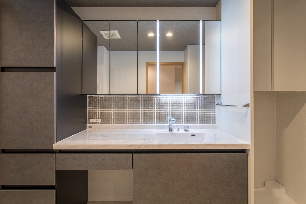 洗面化粧台はLIXIL製の『ルミシスボウル一体タイプ』 既製品とリフォシーでの造作の組み合わせで完成したこだわりの洗面室です。 洗面台向かって左側はパウダースペースになっており、椅子に腰掛けてお使いいただけます。 毎日目に入るモザイクタイルは奥様にお選び頂き、こちらで施工しました。 造作の収納も二か所増設し、ルミシスの収納と合わせ大容量となっています。 洗濯機置き場は出来るだけすっきりと給水と電源が上部収納の扉で見えない仕様に。