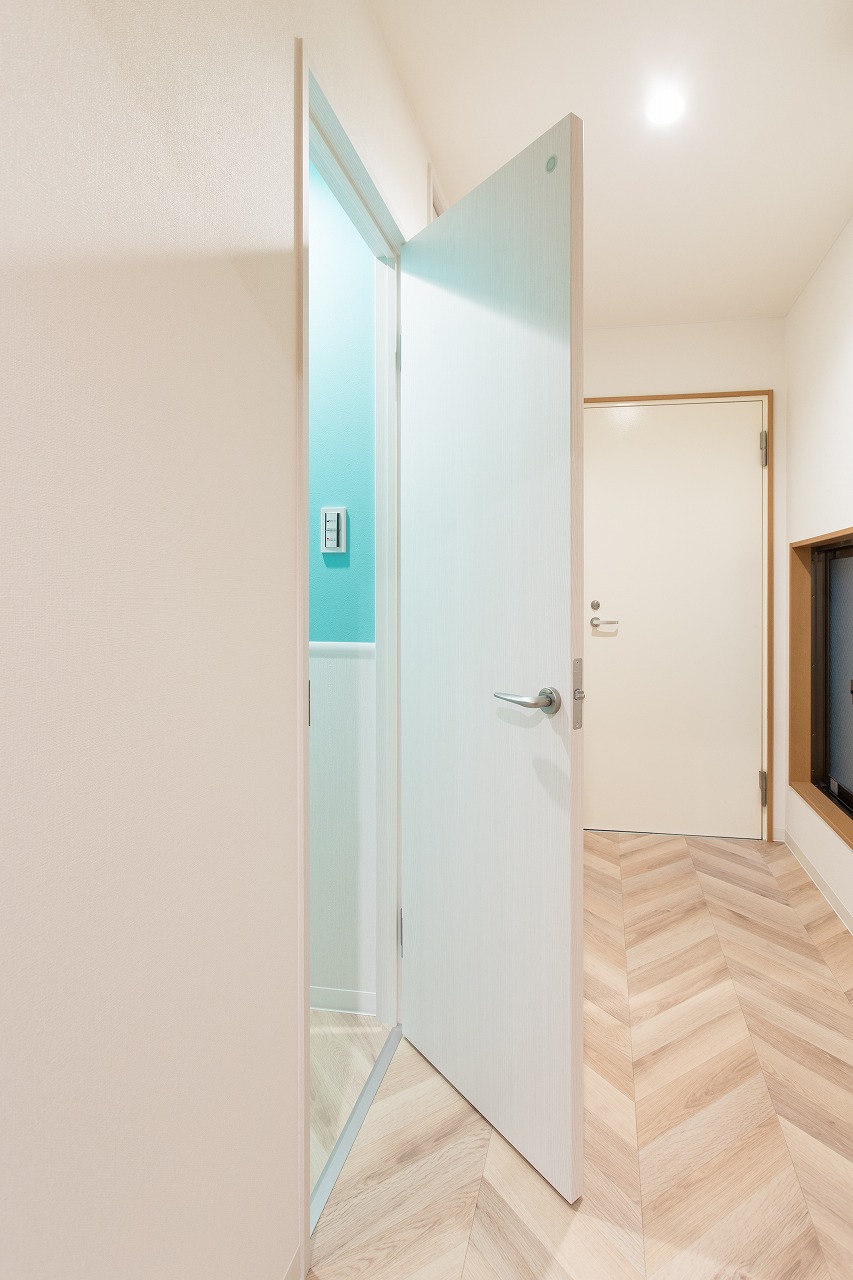 明るい木目調のヘリンボーンで統一された廊下とトイレ床。 こちらはクッションフロアですのでお手入れ簡単です。 トイレの壁はぱっと気持ちが明るくなるティファニーブルーに。数あるブルーのクロスの中から奥様により近い色味をお選び頂きました。 限られた空間の中にも、小さな収納スペースをつけました。