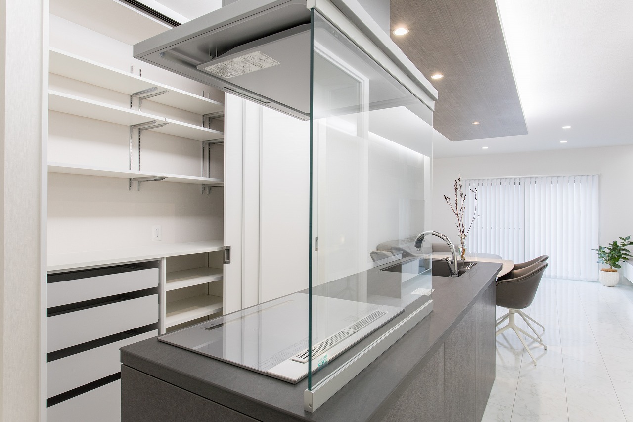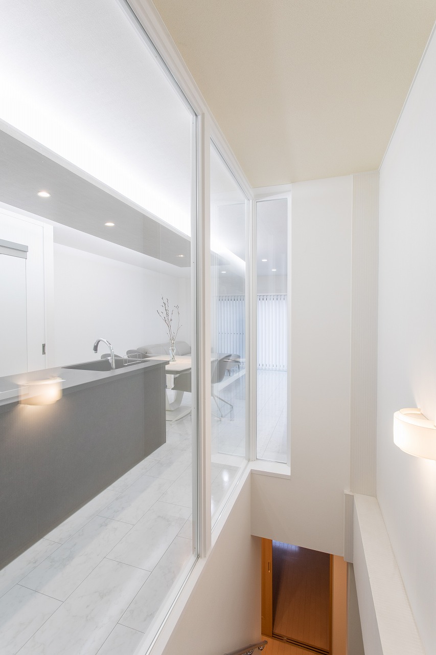 ▲こちらは玄関からガラス壁を通して見たLDK。キッチン後ろの棚を閉めるとスッキリします。急な来客にも安心。