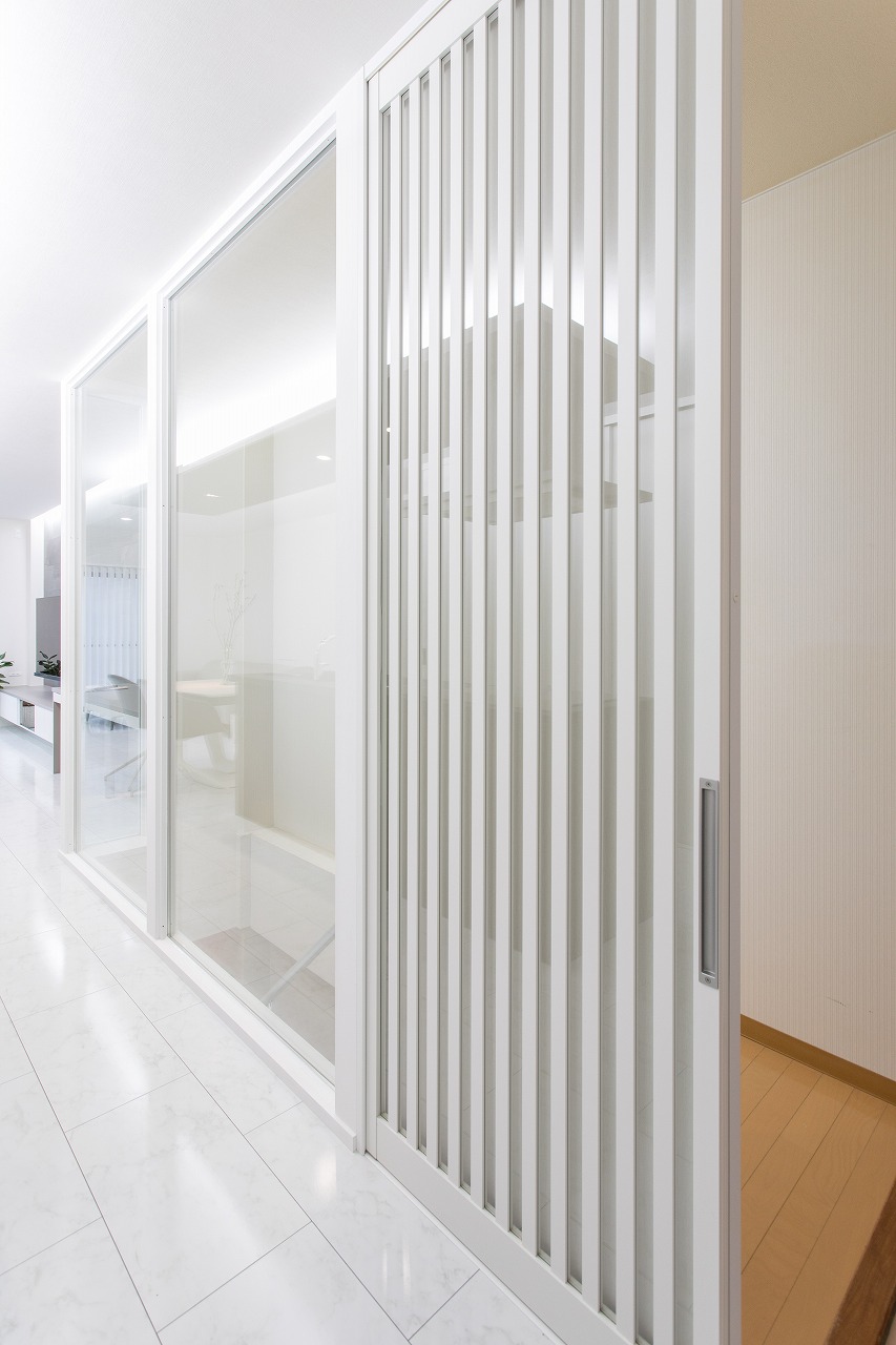 玄関からLDKに入る建具は、ガラス壁と統一感のある光を通すタイプの建具(引き戸)になりました。 天井高がありますのでサイズオーダーいたしました。 この建具とガラスの間仕切りは二期工事で天窓のある廊下と繋がりができる予定です。 昼間は光が差し込み、ガラスの間仕切りが生きるのではないかなと楽しみです。