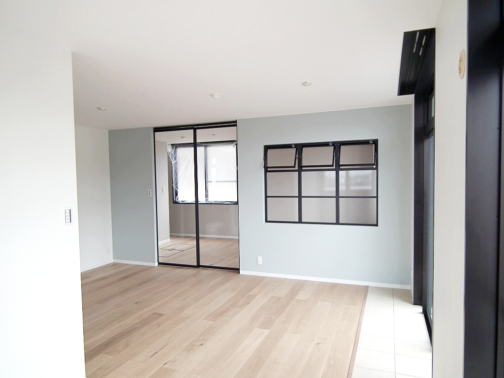 2枚引き込みのアイアンのガラス間仕切り建具で、空間を緩やかににつなげております。