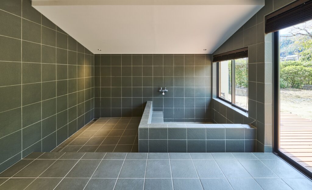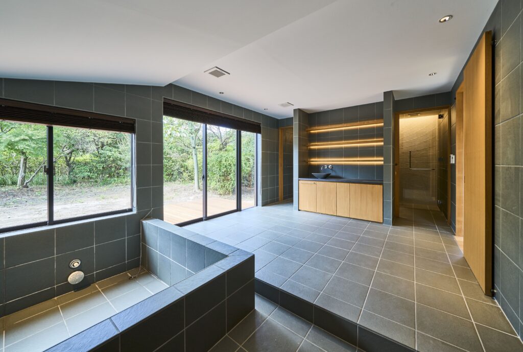 ▼浴槽はタイル仕上げの大きな浴槽になりました。 浴室外部の窓には広めのウッドデッキがあり外気浴しながら庭も見ることができます。
