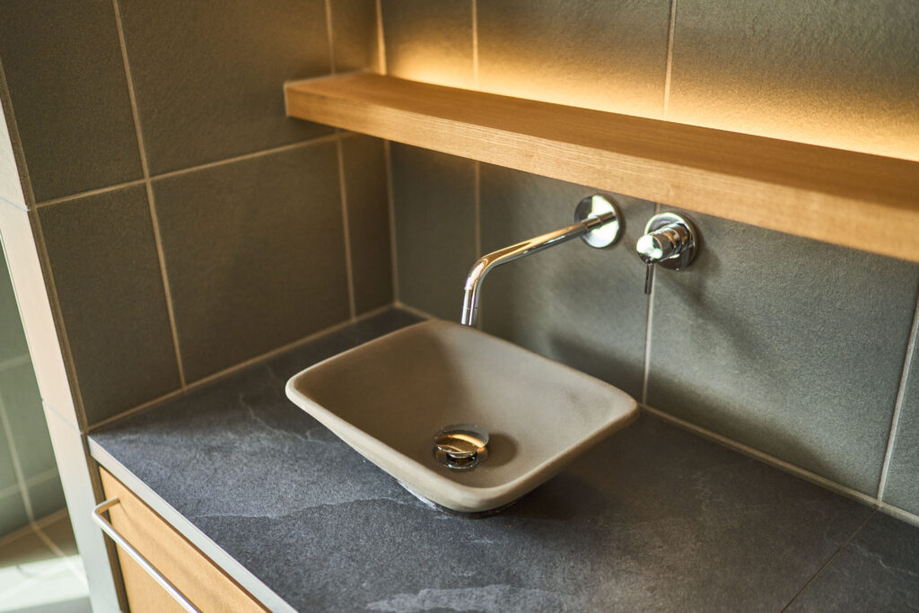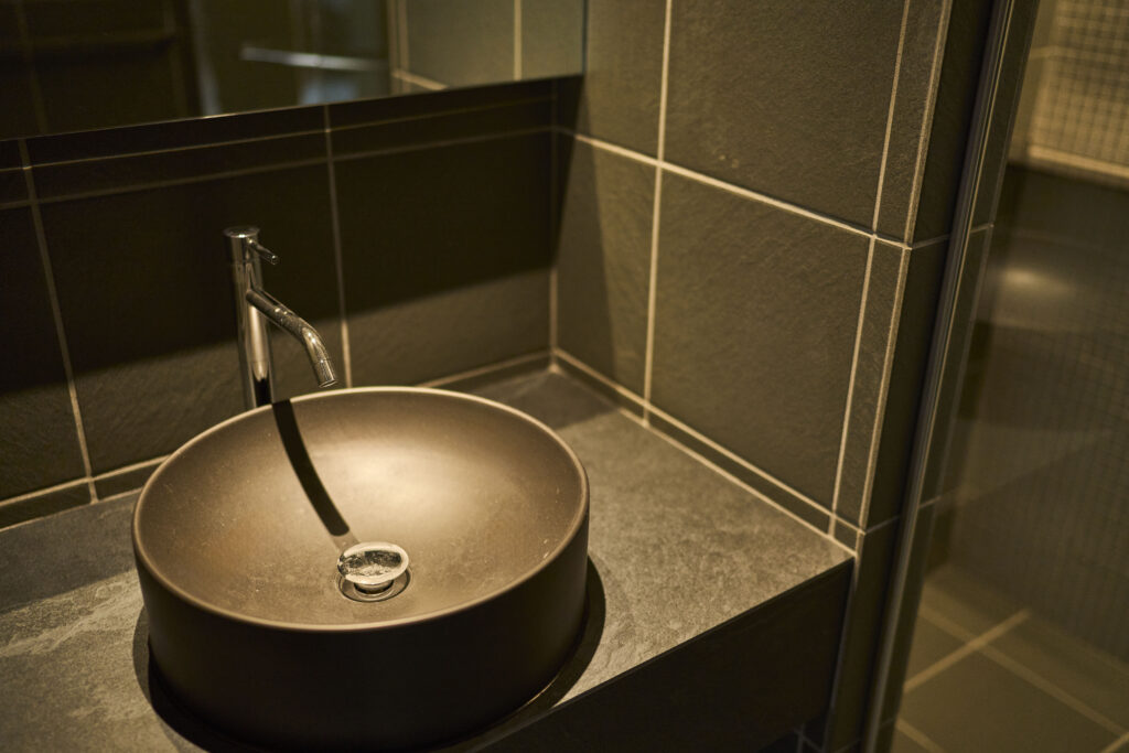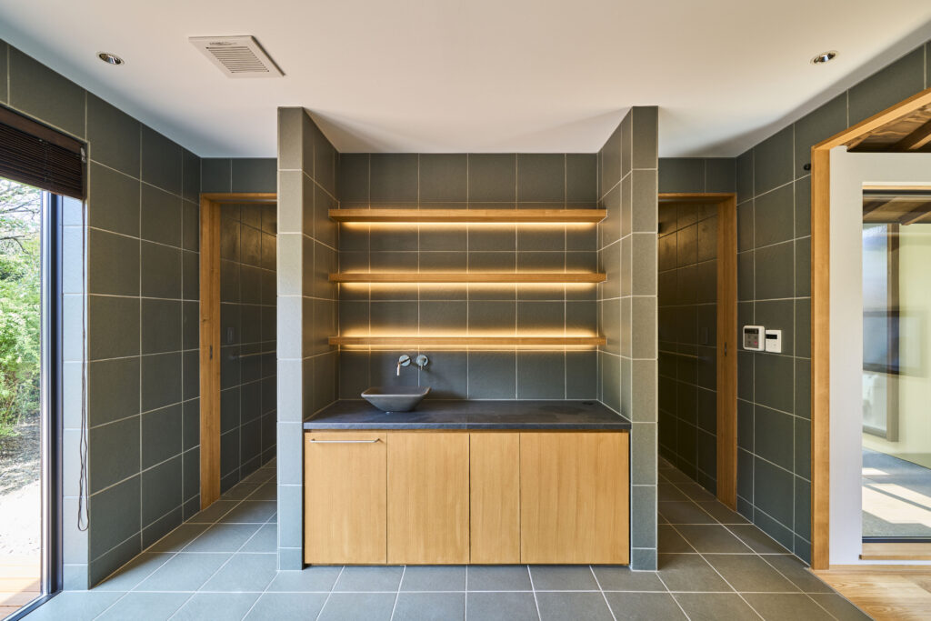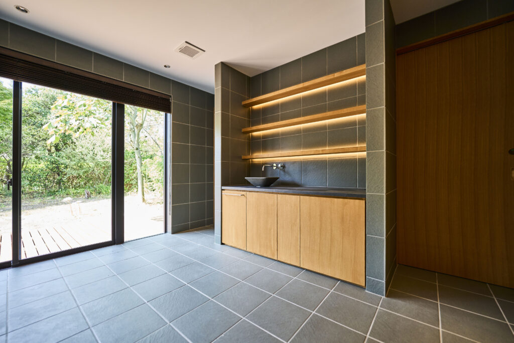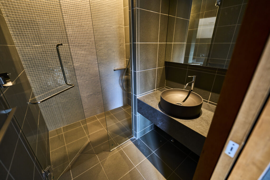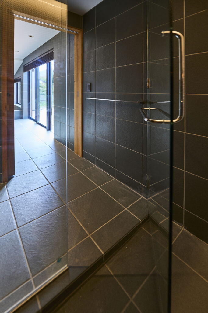 ▼壁、床がタイル仕上げで片面にみアクセントでタイルの種類を変えています。 造作の洗面カウンター部分もタイル仕上げになっています。 入口には強化ガラスの扉を取付しています。