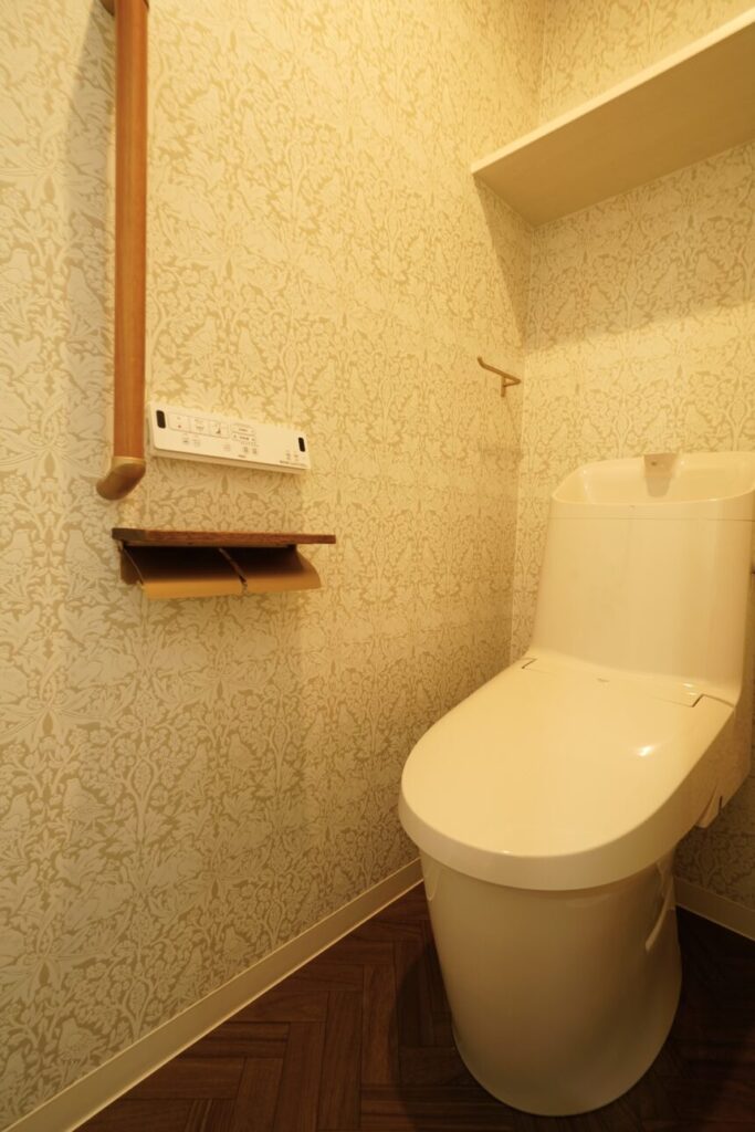 真鍮製のペーパーホルダーやタオル掛けはF様よりご支給いただきました。クッションフロアのヘリンボーン柄も合っていてとても雰囲気のある落ち着いた空間となりました。
