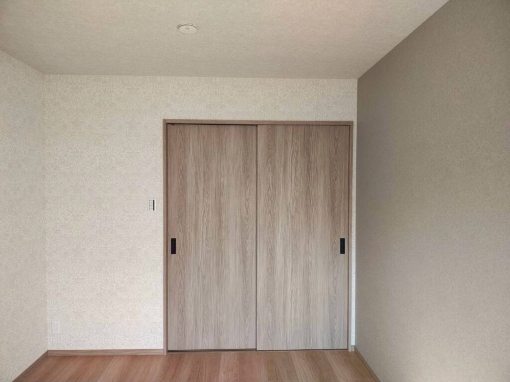 とても気に入ってくださったデニム調のアクセントクロスを固定棚の上にも施工しています。