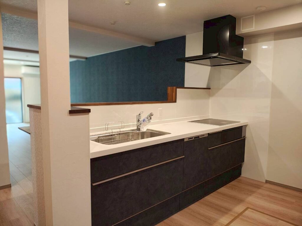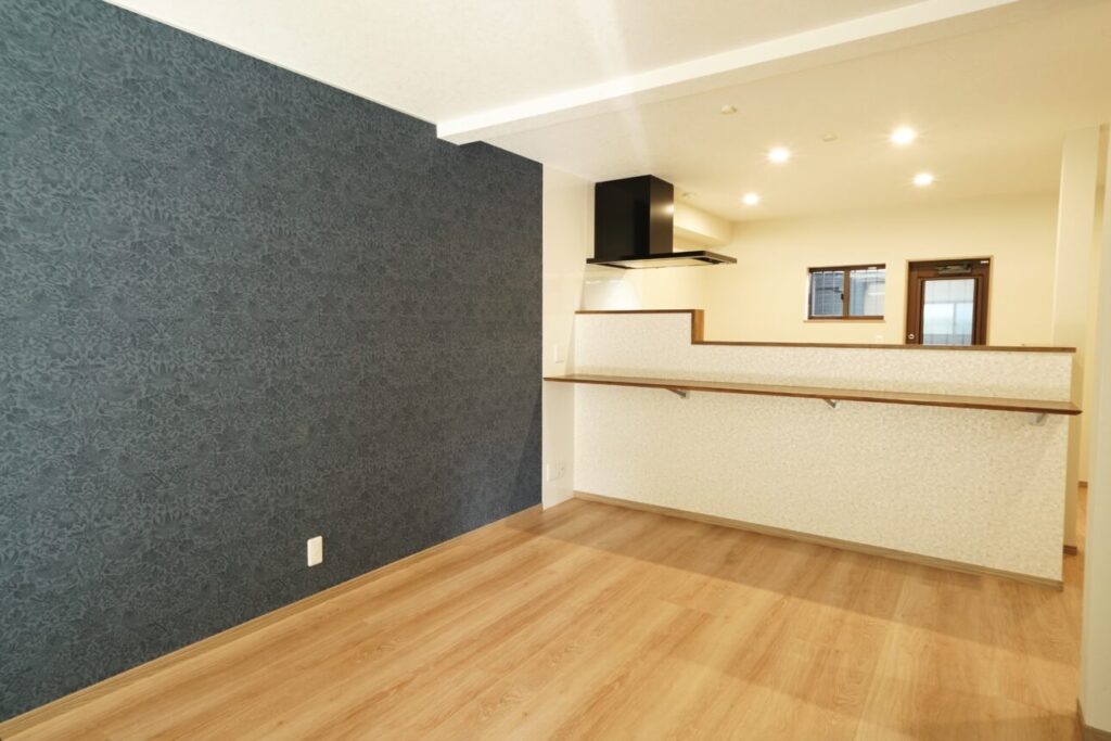 色味の違う同じ柄を採用されたため統一感がありつつキッチンとリビングで違う気分を味わえるLDKとなりました。