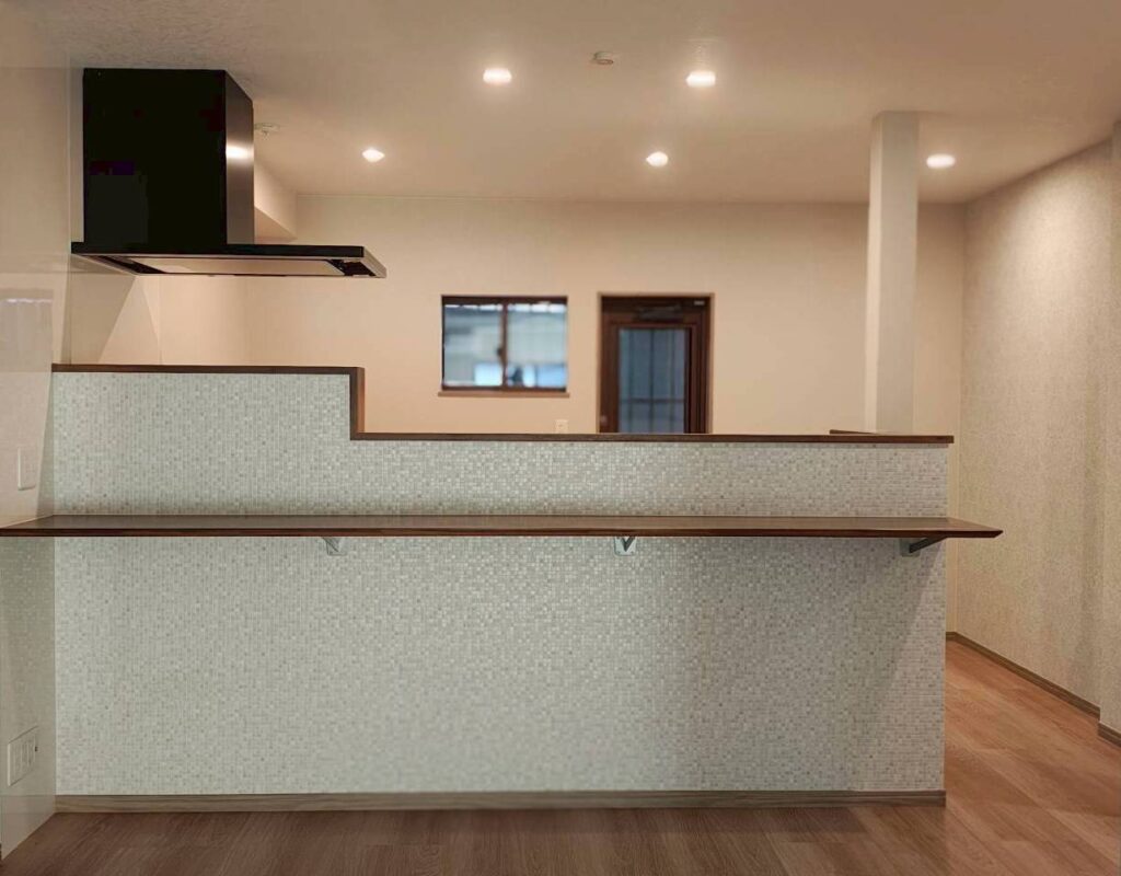 カフェのようなカウンターテーブルをイメージされ、腰壁にはタイル調のクロスを。カウンターチェアを使用されるとのことで、カウンターは床から90㎝の高さです。