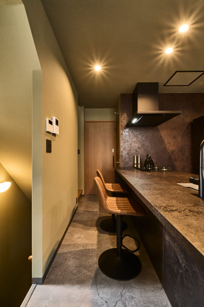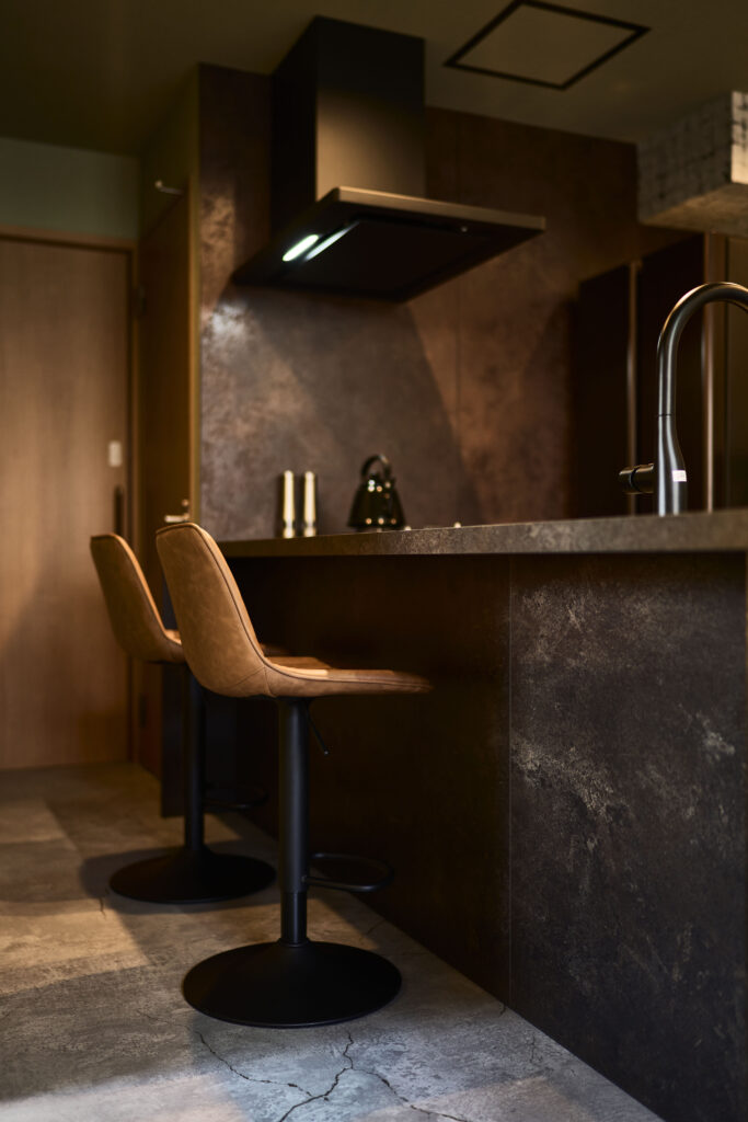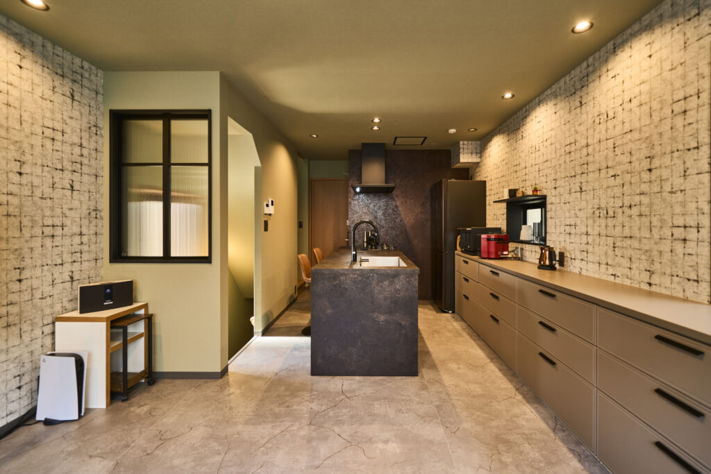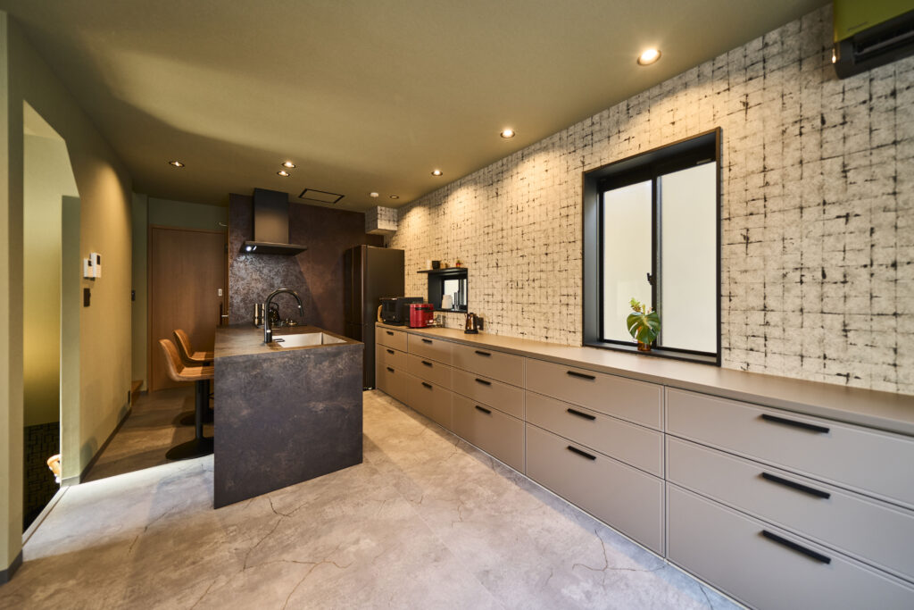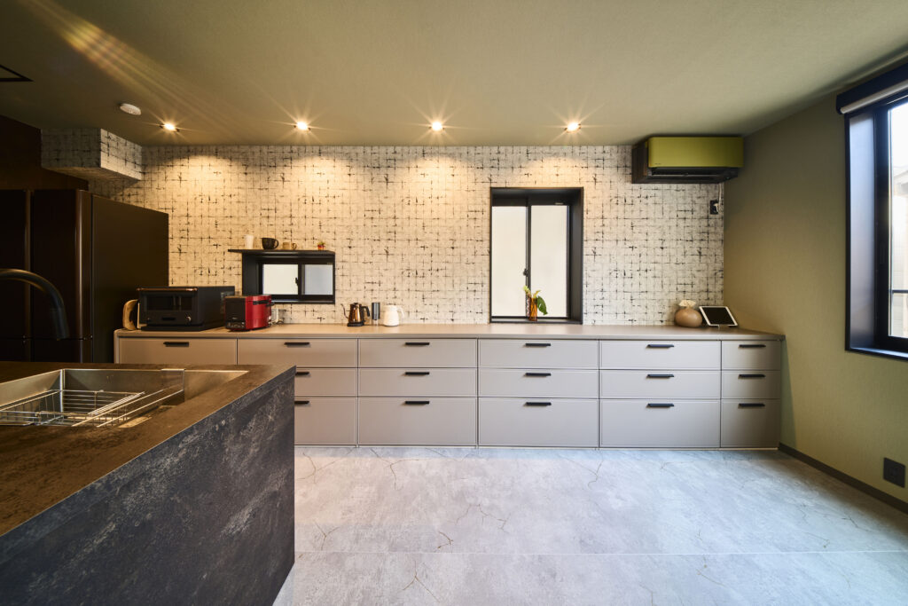 今回の工事の主人公とも言えるキッチンは、キッチンハウスのセカンドラインとして誕生したブランド【グラフテクト】です。 面材の色柄をかっこよく、水栓やレンジフードもブラックでかっこよく、AICAのキッチンパネルも高意匠タイプの商品でかっこよく。とにかくキッチン周りはかっこいい組み合わせで。 見た目だけでなく使い勝手も考えて、シンク下はオープンスペースにしてゴミ箱を収納できるようにし、既存キッチンにはなかった食洗器も新設しました。