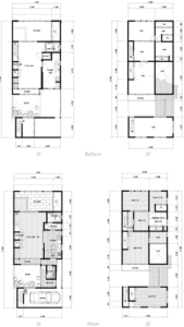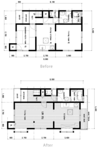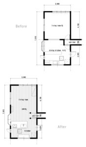 上の図面が施工前、下が施工後です。和室とダイニングを、ひとつの広いLDKにまとめ、キッチンとのつながりも出しました。