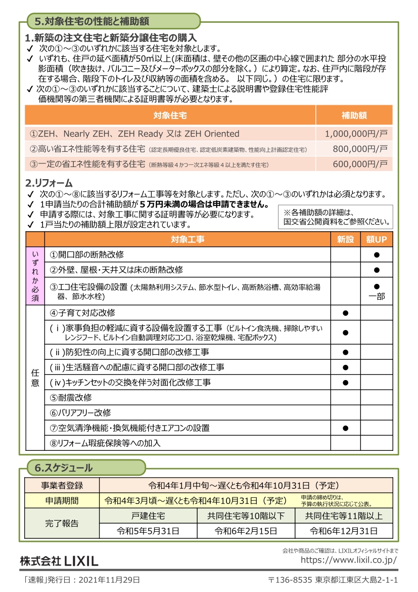 〇令和3年11月26日から令和4年10月31日までに契約の締結等を行い、住宅を整備・分譲する事業者が所定の手続により事務局(今後国が選定)の登録を受け、その後に着工したものが対象。