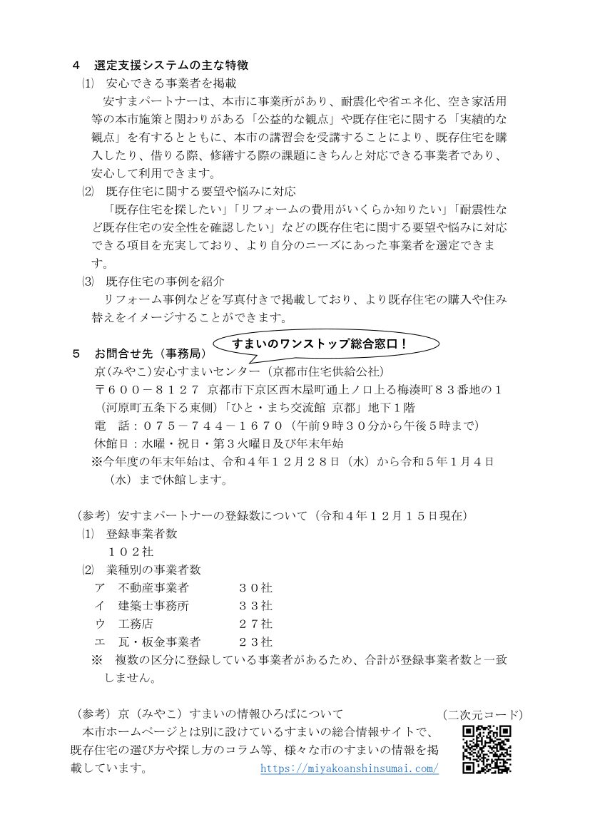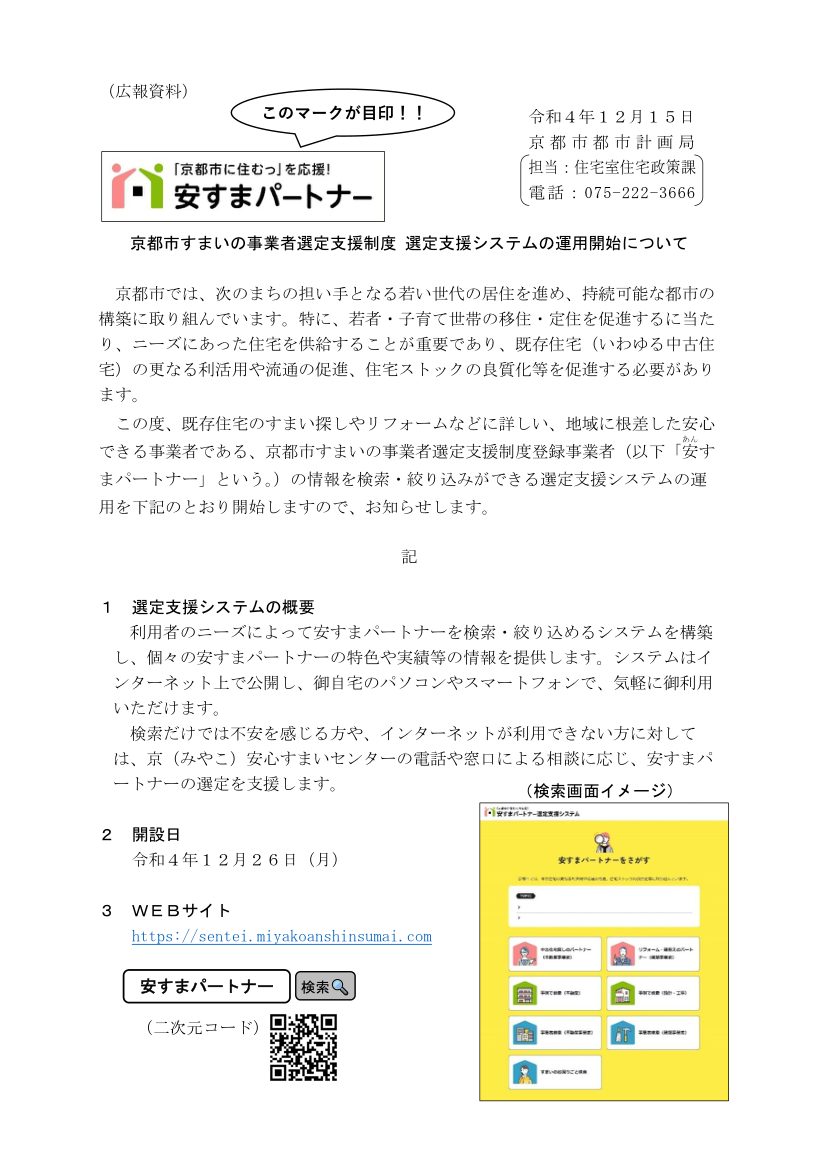 既存住宅のすまい探しやリフォームなどに詳しい、地域に根差した安心できる事業者である、京都市すまいの事業者選定支援制度登録事業者の情報を検索・絞り込みができる選定支援システムの運用を開始されました。