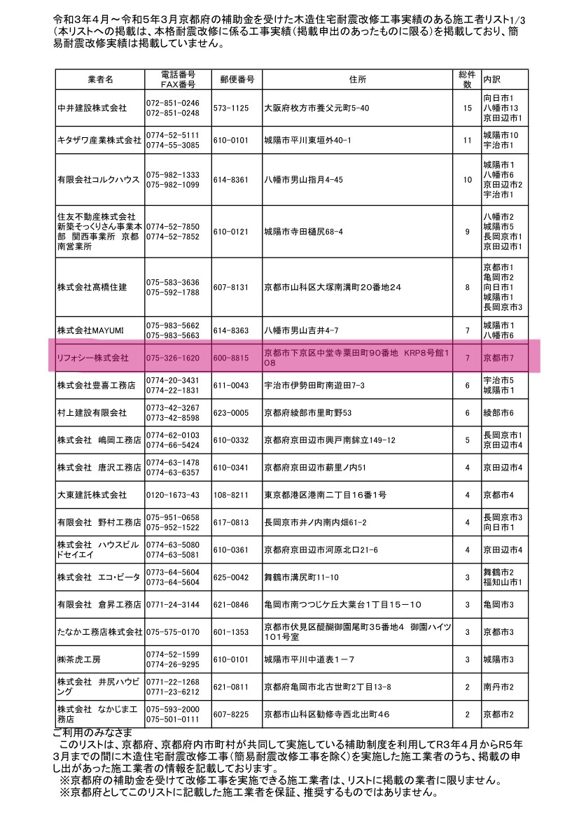 2024/04/24 お知らせ リフォシーの耐震工事 実績件数!! 京都府の補助金を受けた木造住宅耐震改修工事の実績件数がこちらに記載されています。 リフォシーではありがたいことに京都市を中心にたくさんの依頼を頂き、耐震工事を行っております。 たくさんの方に耐震の大切さを伝えていくことができ大変うれしく思います✨ 気になるな~って思う方はぜひ調査だけでもしてみてください!! その際はぜひリフォシーにお任せ下さい😊 前の記事へ 一覧 次の記事へ