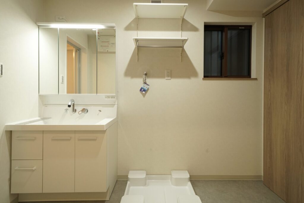 洗面室には廊下側とキッチン側の2箇所の入り口を設けました。